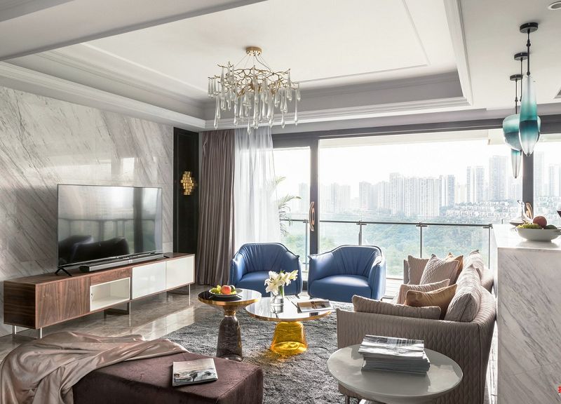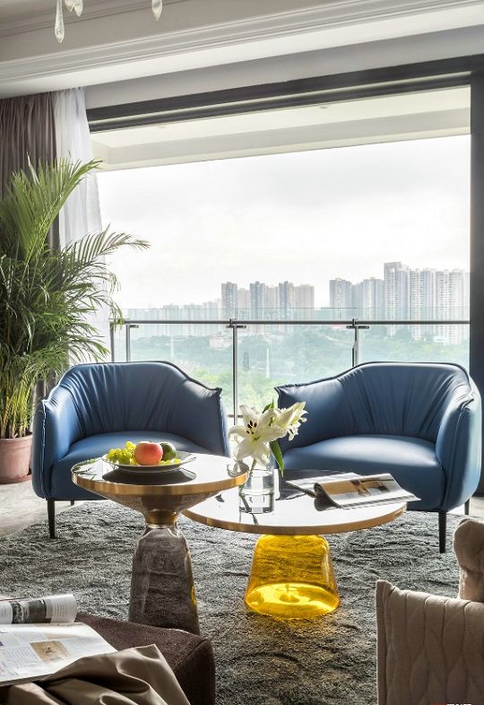 設(shè)計(jì)師根據(jù)住宅周圍環(huán)境的格局?jǐn)U張了室內(nèi)空間和戶外空間的聯(lián)系,通過質(zhì)感強(qiáng)烈的不同材質(zhì)搭配,從紋理自然的大理石到充滿工業(yè)美感的金屬燈具,從藍(lán)色質(zhì)感的皮沙發(fā)到黃色透亮的玻璃茶幾,解放思維上的束縛,構(gòu)建一個(gè)現(xiàn)代的生活故事。