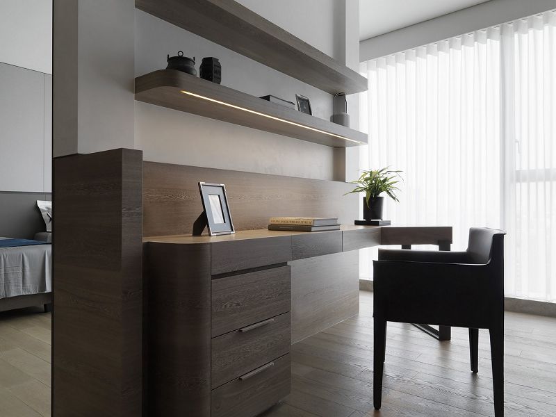 本案為現(xiàn)代極簡風格,設計師多注重空間的合理化和實用性,多種柜子的設計既美觀又能帶來強大的收納功能。冷調的基礎上點綴暖色,增加了設計的層次感,讓簡約不簡單。