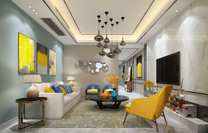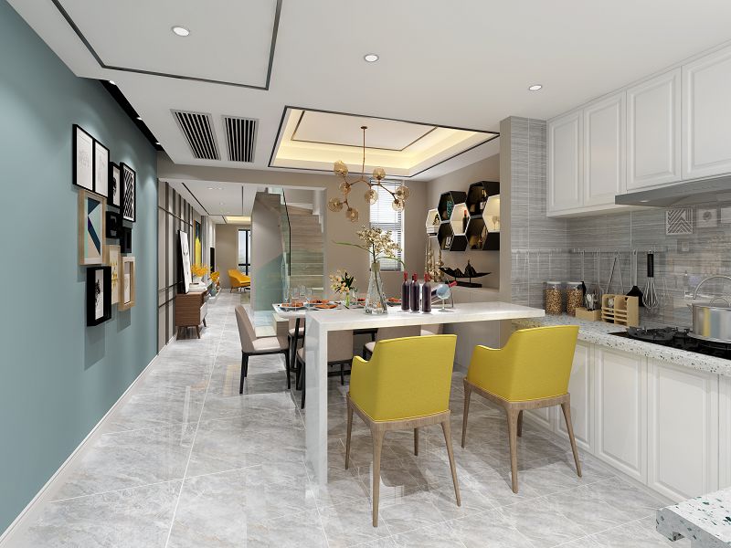 本案以作為現(xiàn)代時(shí)尚風(fēng)格,地面采用了現(xiàn)在比較流行的高級(jí)灰地磚,電視墻采用爵士白大理石,開放式廚房及吧臺(tái)搭配黃色的吧椅為整個(gè)空間增添了不一樣的生機(jī)。臥室無主燈設(shè)計(jì)及定制墻畫給兒童增添了成長快樂。