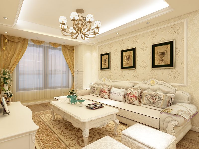 地面是淺米黃色地磚,客廳做了拼花造型,墻面歐式墻布,電視背景高檔石材斜鋪上墻,配上石材線條和深色歐式墻布材料,突現(xiàn)了空間的豪華與氣勢。沙發(fā)背景石材線條框加上油畫,體現(xiàn)了簡歐風(fēng)格的典雅與溫馨。天花跌級的造型,增添了空間的氣勢和層次感,窗簾、燈飾、裝飾品等同時增加了空間的華美。整體空間時尚,華美。整體空間時尚,大氣,溫馨浪漫而有氣勢。