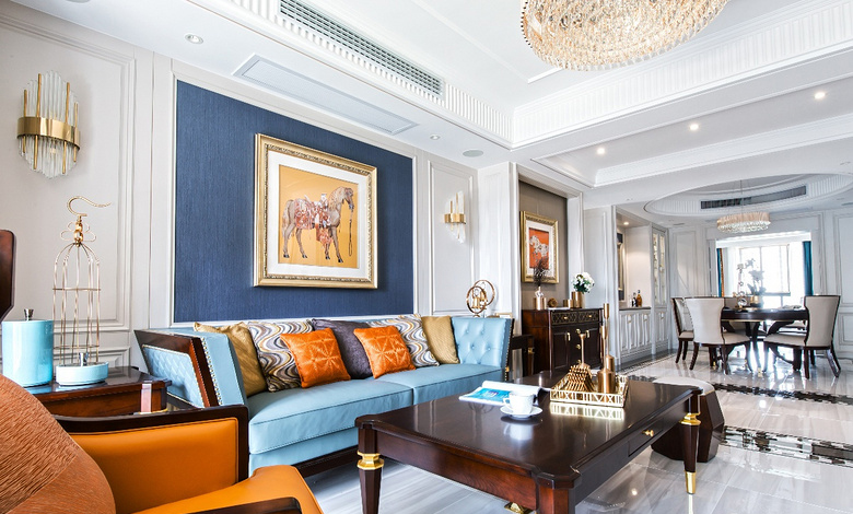 這次的從風(fēng)格上,設(shè)計師并沒有去做國內(nèi)比較主流的歐式或美式。設(shè)計師定義為輕奢的現(xiàn)代美式,顏色明快,但是有層次,法國灰的墻板搭配雅士白的大理石與仿大理石的瓷磚地面遙相呼應(yīng),使客廳的隱形門不顯刻意的藏入其中,顏色上面大面積選擇大地色(米色,白色,灰色等),使設(shè)計師在平面規(guī)劃的方案中要表現(xiàn)的大宅的體量感得以呈現(xiàn),軟裝上配了時下流行的墨綠與金色做點(diǎn)綴,金色的使用量嚴(yán)格控制到恰到好處,使空間奢華但不浮夸,整體空間達(dá)到雅致與高檔的平和點(diǎn)是設(shè)計師這次風(fēng)格設(shè)計的最重要的一點(diǎn)。