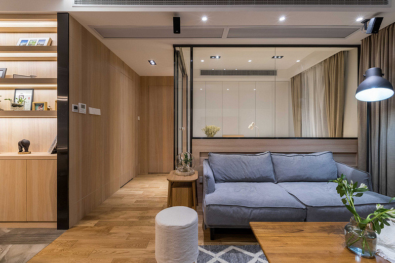 以木質(zhì)打造的圓形茶幾家具,搭配木質(zhì)地板,整體空間給人一種現(xiàn)代舒適的氛圍,輕松休閑的感受。