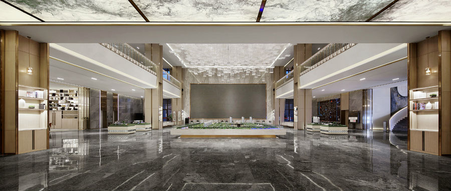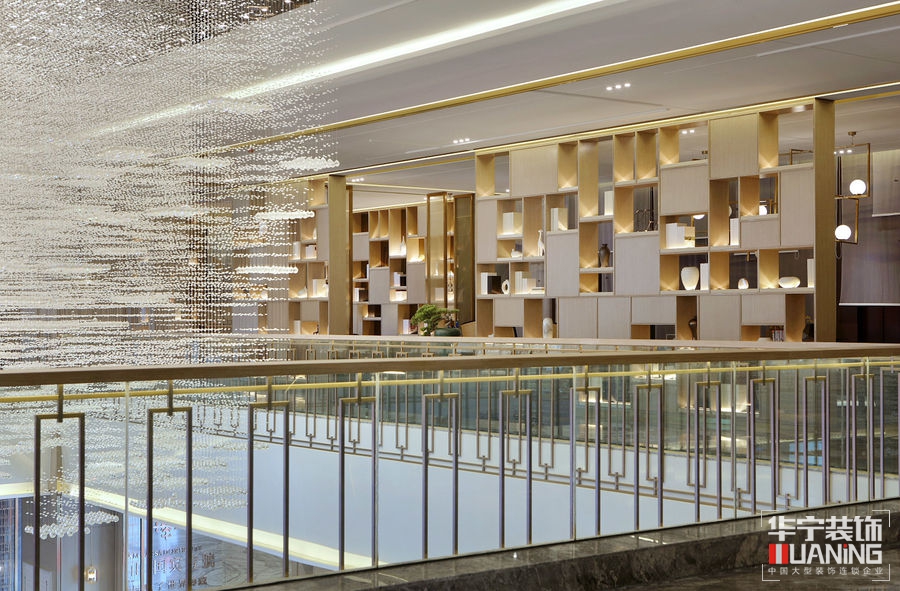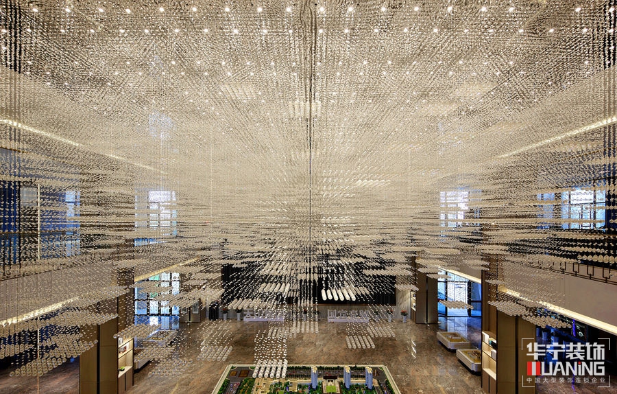 垂感十足的細(xì)密晶體似無數(shù)顆流星直線流墜于沙盤上空區(qū)域,映照滿堂的光輝燦爛,充分展現(xiàn)出沙盤區(qū)的莊嚴(yán)雅致。