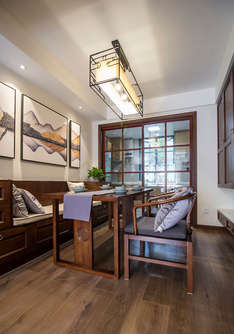 設(shè)計拋卻以往中式設(shè)計中所使用的中國紅,選用淡雅的杏色,讓整個空間都透露著年代的沉淀感,多了幾分書香韻味,少了以往中式設(shè)計中的威嚴(yán)與奢華,整個空間顯得溫馨而恬淡,家的感覺更加濃厚。