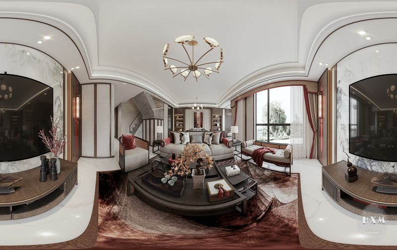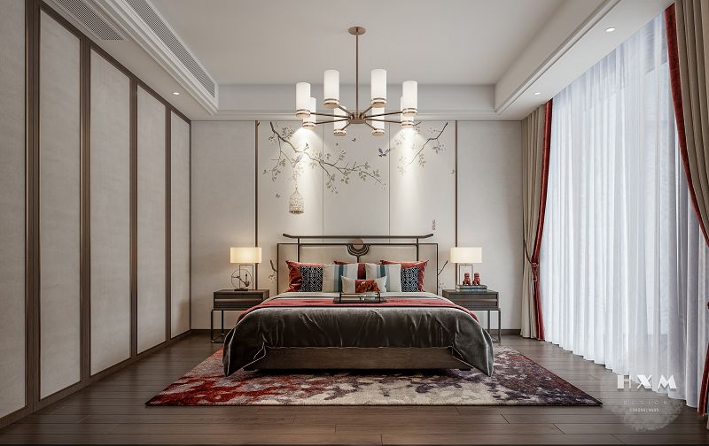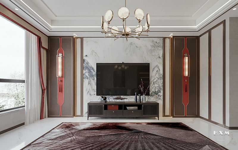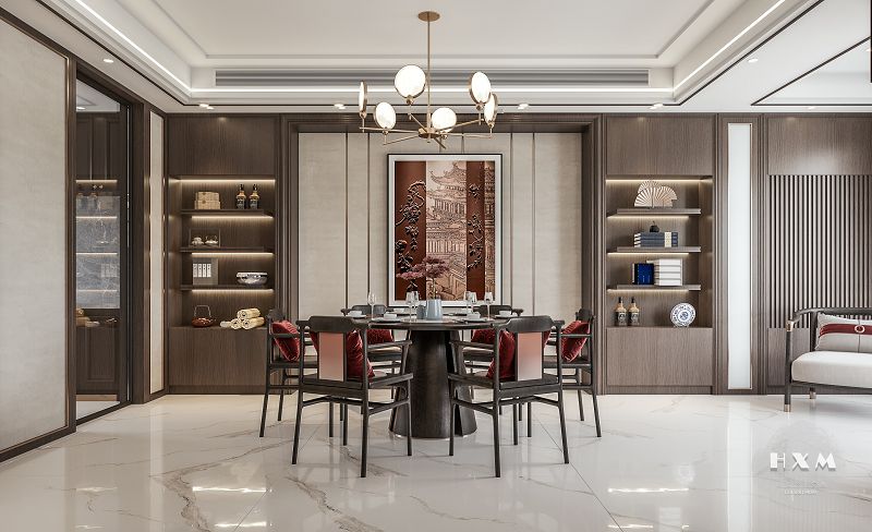 新中式表達(dá)對(duì)清雅含蓄、端莊豐華的東方式精神境界的追求,中國(guó)風(fēng)的構(gòu)成主要體現(xiàn)于傳統(tǒng)家具、裝飾品及黑、紅為主的裝飾色彩上。室內(nèi)多采用對(duì)稱式的布局方式,格調(diào)高雅,造型簡(jiǎn)樸優(yōu)美,色彩濃重而成熟。