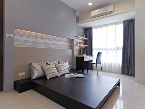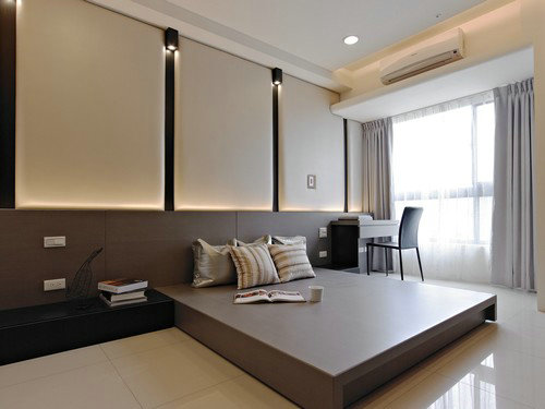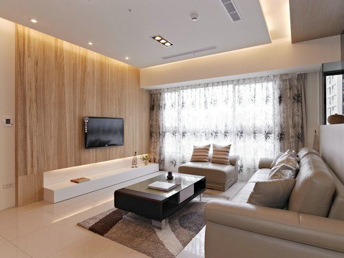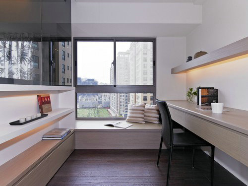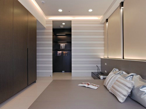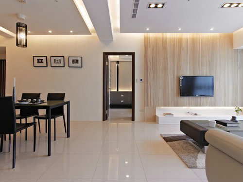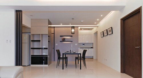 設(shè)計(jì)概念: 原有的空間設(shè)計(jì)已賦予本案采光絕佳、格局方正、動(dòng)線流暢的完善基礎(chǔ),屋主還希望能有獨(dú)立的書房空間,因此設(shè)計(jì)師縮短客廳沙發(fā)背墻與電視墻的距離,在沙發(fā)后增設(shè)L形短墻,上方以灰色強(qiáng)化玻璃讓視線可直探書房底端,保留視覺的穿透,也完成屋主的生活期待。
