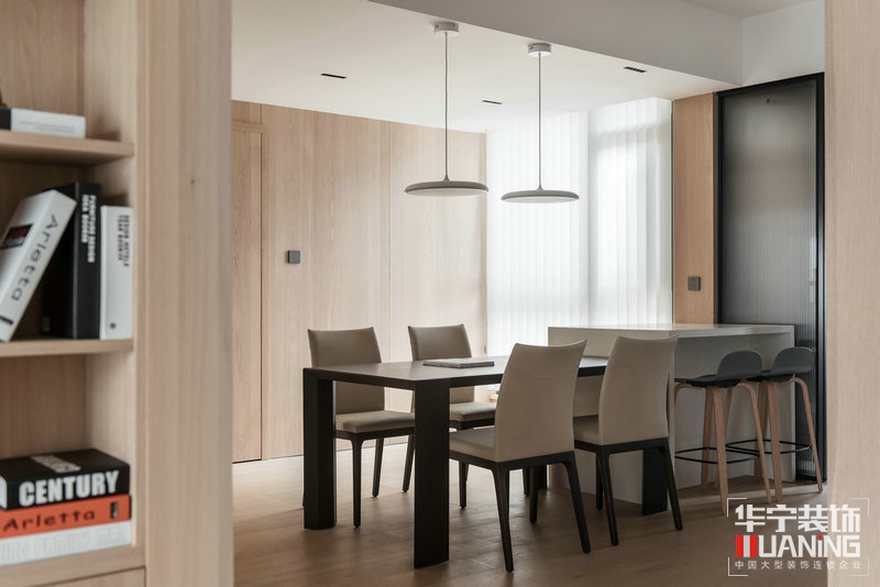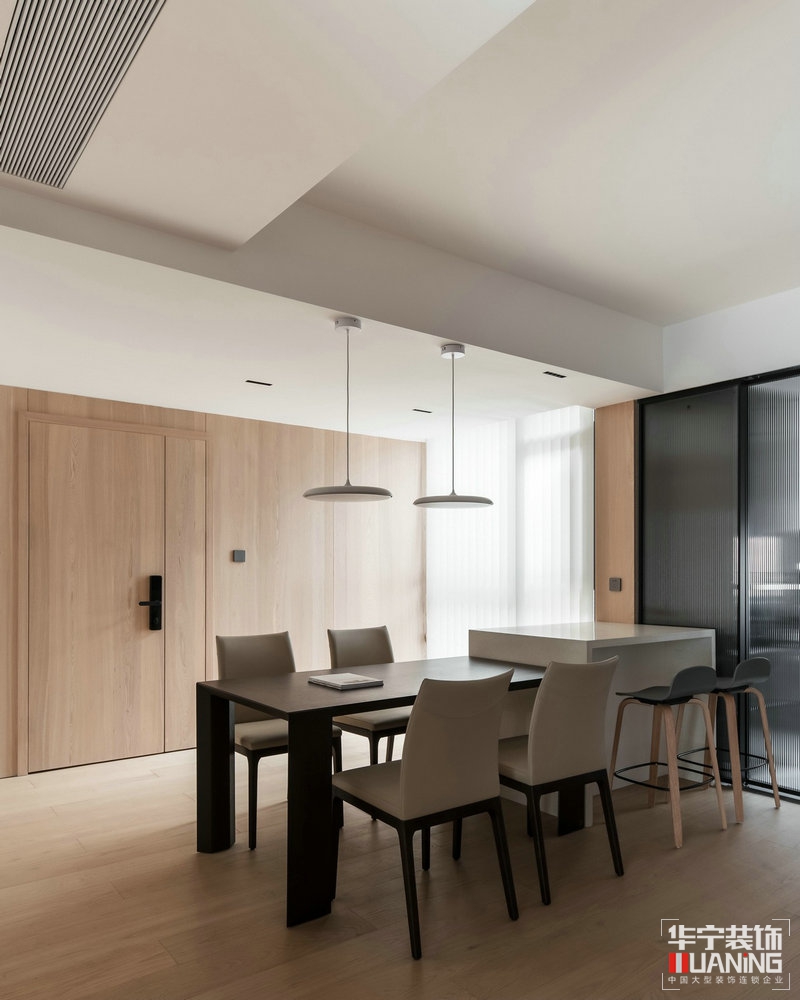 設(shè)計(jì)概念:在一個(gè)繁榮的都市城市中, 住一所簡(jiǎn)約、高雅、舒適的住宅,其實(shí)就是生活在工作之后能使我們卸下負(fù)擔(dān)讓人放松的空間。將入戶玄關(guān)并入餐廳區(qū)域,增加空間的通透性,讓原本擁擠的餐廳空間變得敞亮。