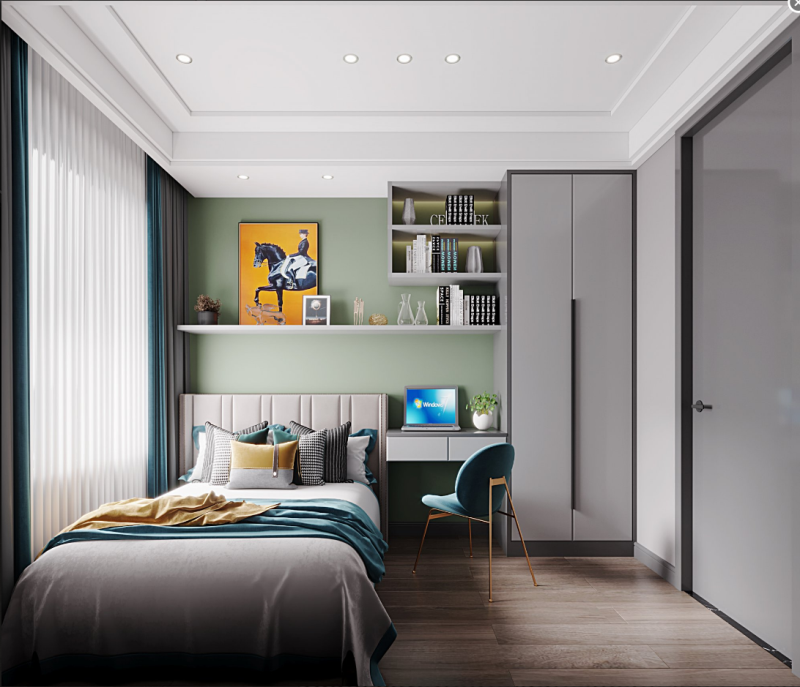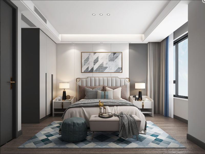 本文案大面積灰色墻布的基礎(chǔ)上,融入了一些金屬材質(zhì),例如房門及柜門的拉手、柜體、還有一些小的裝飾品等都會出現(xiàn)類似的金屬元素,因為適當(dāng)?shù)暮谏c綴能夠讓沉悶的空間顯得更加生動有層次,它可以很好的突破沉悶,自帶光芒卻張揚!從而達(dá)到色彩繁與簡之間的平衡,再搭配金屬飾品、素色裝飾畫,以及簡約的藝術(shù)品,拼湊出現(xiàn)代、舒適、愜意的放松空間。