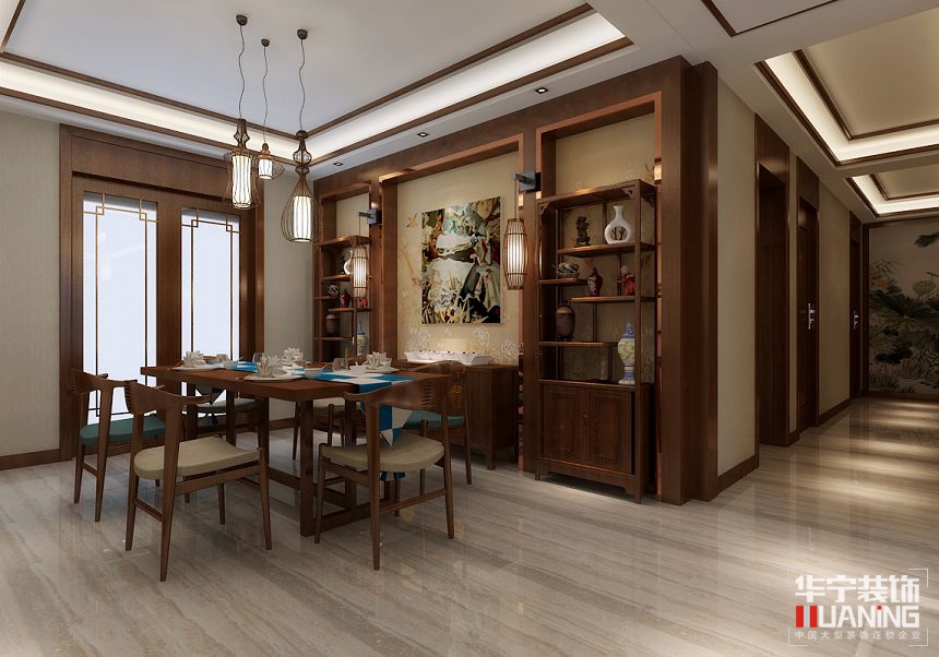 客廳與餐廳以沉穩(wěn)的紅棕色調(diào)為主,地板則偏向恬淡的淺色系,大面積的白色鋪色,不僅使人視線得到擴展,放松,更是體現(xiàn)了空間設(shè)計中的有限空間里制造縱深感的設(shè)計理念,簡約化的中式“博古架”,通過這種新的分隔方式,單元式住宅就展現(xiàn)出中式家居的層次之美。在配飾的選擇方面,飾以精巧的燈具和雅致的掛畫,使整個居室在濃濃古韻中滲透了幾許現(xiàn)代氣息。