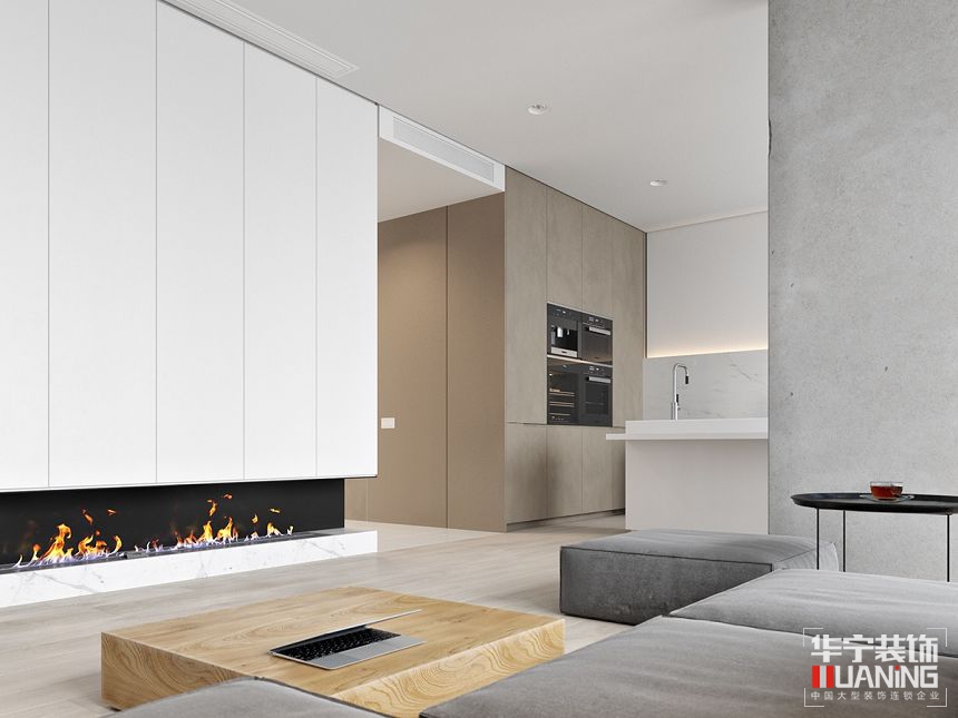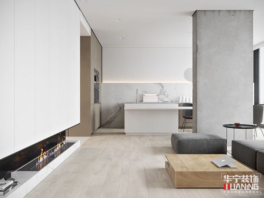 整個空間以白色調(diào)為基底,搭配淺灰色的沙發(fā),窗簾,在良好的采光下營造出透亮,潔凈的視覺感受,溫潤的木質(zhì)茶幾,熊熊燃燒的爐火成為溫暖空間的元素。 整個公共空間被劃分為三個區(qū)域,中央為客廳,一側(cè)為廚房,另一側(cè)則通過隔墻和窗簾形成獨立的閱讀時,整排的置物柜,整齊的書籍,充滿線條感的座椅,獨特的裝飾品,都為這個白色空間增添生活氣息。