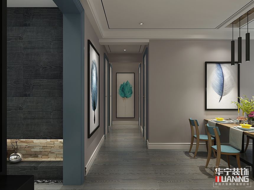 整體空間以灰色調(diào)為主,黑色的搭配,加上原木色的組合,更貼近自然的寧靜,可以讓人輕松的同時又不會感覺冷,客廳通過LED筒燈來烘托整體空間。餐廳綠色的背景體現(xiàn)了年輕的生命力,加上創(chuàng)意吊燈,整個空間充滿年輕的活力。