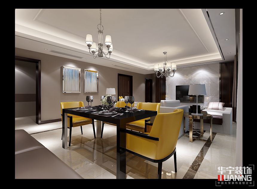 本案以冷靜的黑、白、灰色為空間主基調,運用充滿活力的黃色點綴空間。不同明度、材質、質感的黃色元素相互搭配,豐富了空間的色彩層次。簡單的吊燈,自然的花藝擺件,絲綢材質的窗簾、靠包、餐墊等配飾相得益彰。沙發(fā)則是舒服的棉麻材質。橫條幾何形地毯,強化黑白節(jié)湊的動感主題。