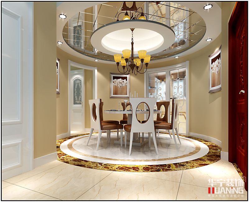 此方案的風(fēng)格傾向定位為簡(jiǎn)歐設(shè)計(jì)風(fēng)格。本套戶型原為經(jīng)典的三房?jī)蓮d居室,戶型比較方正,五口人居住,本設(shè)計(jì)在布局上增加了一個(gè)大衣帽間,原本進(jìn)門比較緊湊的餐廳設(shè)計(jì)成大膽的圓形餐廳,為了保證空間的開闊性和通透性,空間裝飾多采用簡(jiǎn)潔硬朗的直線條。直線裝飾在空間中的使用,不僅反映出人追求簡(jiǎn)單生活的居住要求,更富現(xiàn)代歐式感的設(shè)計(jì)風(fēng)格 。
