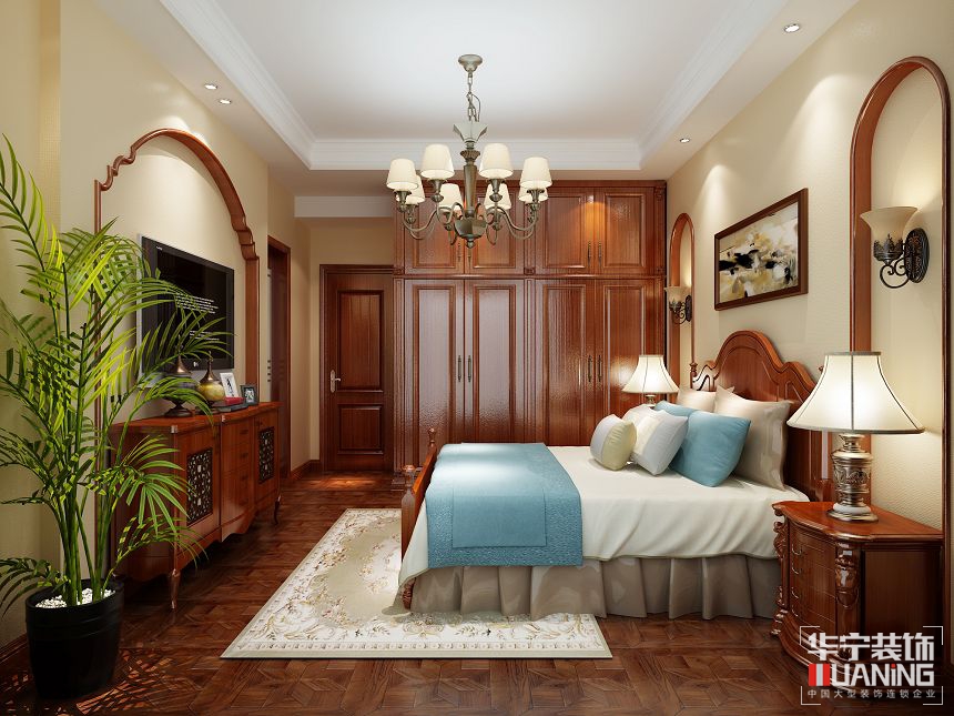 本案一開始是以簡美風格為主調(diào),主要強調(diào)的是大方得體。給人以穩(wěn)重的感覺,但穩(wěn)重而又不呆板。天花沒有采用過于厚重的實木梁來給以美式加分,反倒是采用比較輕快的白色加以石膏線來點綴。墻面雖然有造型,但并不復雜,而且加入了嫩綠色的墻紙來活躍整個空間,使得整個空間多了些靈動。電視墻還是采用了比較常見的壁爐造型演變而來,電視墻墻面貼的磚是采用了幾個顏色的仿古磚隨意的拼貼上墻。使得空間的靈性更足。