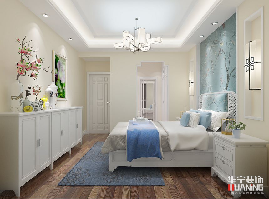 本案所采用的色調(diào)是以暖色調(diào)為基調(diào),墨綠色和淡藍色為輔調(diào)來到達襯托家的舒適度和視覺美觀度。讓其達到一個色彩上的平衡。地磚采用的是比較傳統(tǒng)的中式鋪貼方式(工字形鋪貼),隔斷和門子采用的是橫豎實木條構(gòu)成,以簡潔的方式來體現(xiàn)中式的美感,沙發(fā)則是采用山水水墨畫的麻布材質(zhì)來表達,電視背景則是采用絲綢刺繡的“仙鶴戲梅”來傳達對健康長壽的向往,同時也體現(xiàn)出主人家面對生活挫折堅韌不拔的意志。
