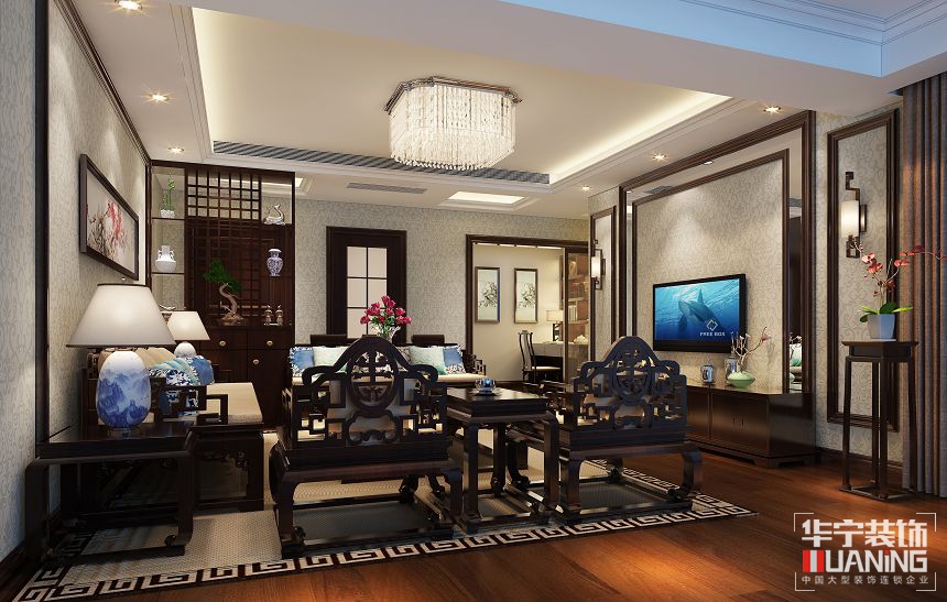 本案風(fēng)格定位為新中式,把傳統(tǒng)的中式元素加以簡化和提煉,以現(xiàn)代人的審美打造古典韻味的事物,讓改良后的中式風(fēng)格體現(xiàn)出優(yōu)雅舒適的生活態(tài)度。設(shè)計(jì)師巧妙地運(yùn)用設(shè)計(jì)語言對中式風(fēng)情做了完美的現(xiàn)代演繹,很好地喚醒人們深藏的記憶和文化認(rèn)同感。在設(shè)計(jì)上,總體呈現(xiàn)出一種氣勢恢宏、優(yōu)雅華麗、細(xì)膩大方的大家風(fēng)范,表達(dá)對清雅含蓄、端莊豐華的東方式精神境界的追求??筒蛷d里,木質(zhì)讓人感覺自然親切,設(shè)計(jì)師大膽地運(yùn)用藍(lán)色系等現(xiàn)代色彩表現(xiàn),并利用鳥雀花卉等圖案來表達(dá)書香的概念,幾處點(diǎn)睛之筆便營造出一個(gè)濃郁的中式韻味空間。置身其中,仿佛能夠忘掉一切世俗紛擾,心靈被中式藝術(shù)氛圍所凈化。