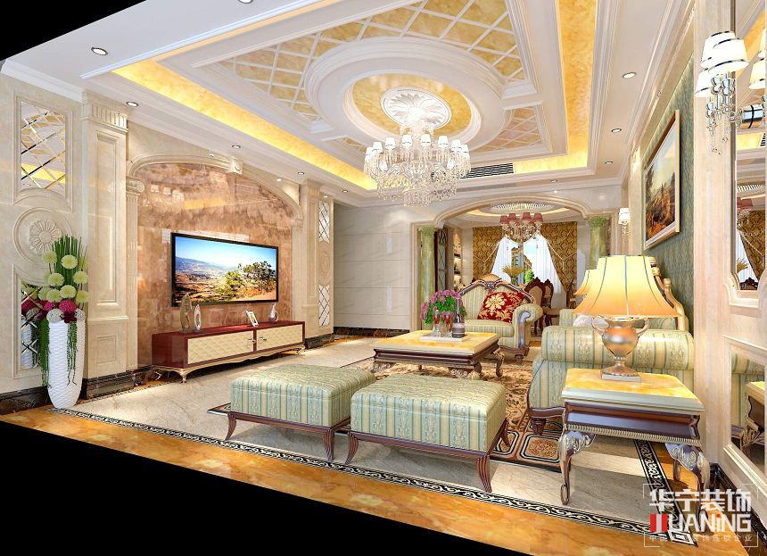 歐式客廳頂部喜用大型燈池,并用華麗的枝形吊燈營造氣氛。門窗上半部多做成圓弧形,并用帶有花紋的石膏線勾邊。入廳口處多豎起兩根豪華的羅馬柱,室內(nèi)則有真正的壁爐或假的壁爐造型,墻面用壁紙,或選用優(yōu)質(zhì)乳膠漆,以烘托豪華效果。地面材料以石材或地板為佳。歐式客廳非常需要用家具和軟裝飾來營造整體效果。深色的橡木或楓木家具,色彩鮮艷的布藝沙發(fā),都是歐式客廳里的主角。還有浪漫的羅馬簾,精美的油畫,制作精良的雕塑工藝品,都是點染歐式風格不可缺少的元素。但需要注意的是,這類風格的裝修,在面積、空間較大的房間內(nèi)會達到更好的效果。