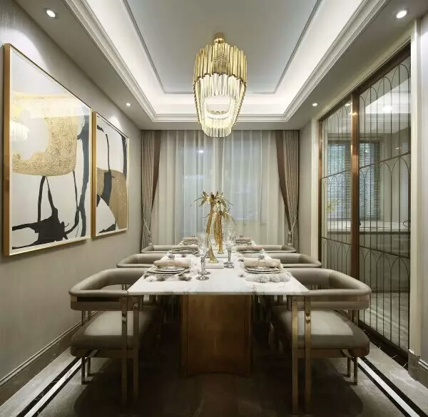 當(dāng)簡單的白與沉穩(wěn)灰,碰撞華貴的金與寧靜的藍(lán),猶如朝陽映照下的塞納河波光粼粼,整個空間縈繞優(yōu)雅沉穩(wěn)的氣息。以不銹鋼線條搭配增加了空間層次感與價值感,剛?cè)岵拇钆涫址ㄕ蔑@典雅與時尚。主臥是典型的法式中軸對稱布置,優(yōu)雅平和的色調(diào)營造完美舒適的臥房空間。甄選Fendi高倍床,與背景墻大型金屬裝置形成強烈的視覺震撼,主人不凡的品味在空間中娓娓道來。