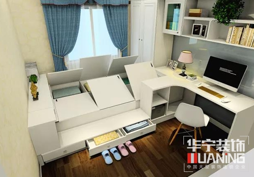 既是書房也是次臥,特意用階梯柜將榻榻米抬高,睡上去也能更好地避免地面濕氣;衣柜+書桌+榻榻米連體式的設計,以免家具落灰難以打掃,用起來1件頂3件,省心又舒心。