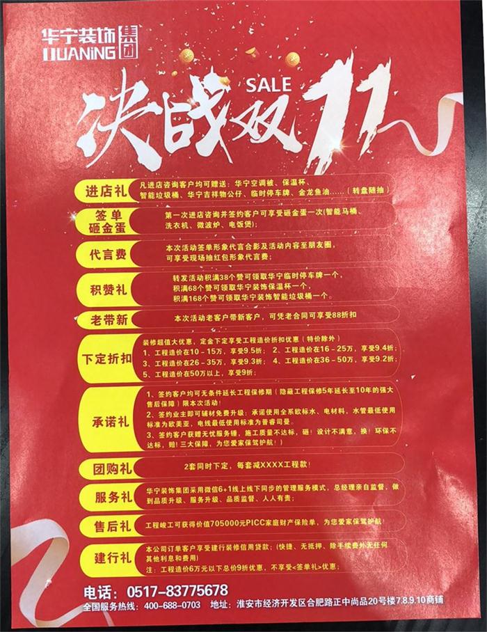 淮安華寧裝飾決戰(zhàn)雙十一,鉅惠豪禮等您來!