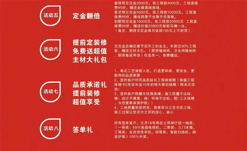 交定金且確定春節(jié)后開工的業(yè)主,年前交30%工程款,贈(zèng)送主材大禮。(廚房墻地磚、衛(wèi)生間墻地磚、廚房集成吊頂)任選其一,免費(fèi)贈(zèng)送。