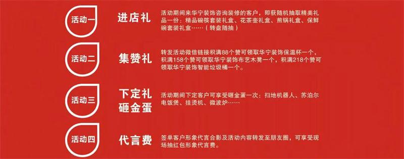 活動(dòng)期間來華寧裝飾咨詢裝修的客戶,即獲隨機(jī)抽取精美禮品一份:精品碗筷套裝禮盒、花茶壺禮盒、煎鍋禮盒、保鮮碗套裝禮盒……(轉(zhuǎn)盤隨抽)