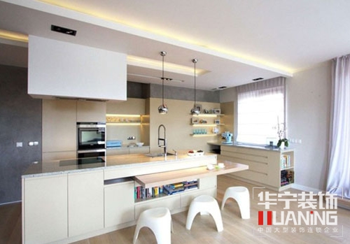 是L型廚房的延伸,一般的做法是在另一個(gè)長(zhǎng)邊再多加一個(gè)臺(tái)面,或是一整個(gè)墻面的高柜,以便收納更多地的物品或電器?!癠型”廚房的基本功能較為好用,操作流程合理,可以容納多人操作。洗滌區(qū)、烹飪區(qū)、操作區(qū)、貯藏區(qū)可以劃分得很明確,能充分利用空間,擴(kuò)大操作面積。