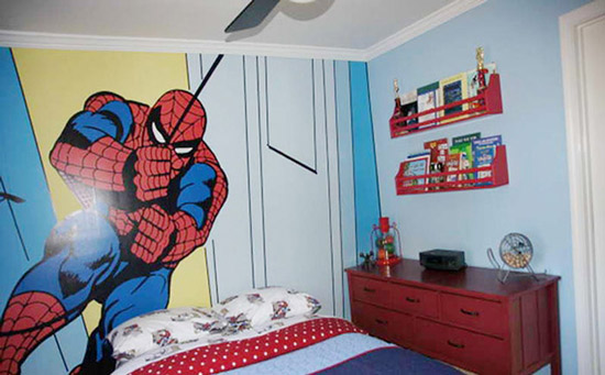 勇敢的英雄能帶給孩子正面的影響,小主人一定非常崇拜蜘蛛俠,將其繪在床頭墻面上,正義的俠士精神伴隨孩子入眠,對(duì)孩子的成長(zhǎng)也是極好的.