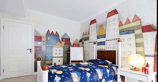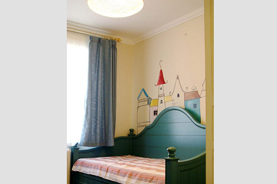 同樣的城堡手繪墻因?yàn)樯嘲l(fā)床的設(shè)計(jì)而變得可愛(ài)起來(lái),弧形的欄桿既是床的裝飾,也點(diǎn)綴了畫(huà)中的城堡,一舉兩得.
