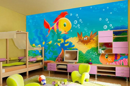 卡通畫(huà)一直是小朋友的最?lèi)?ài),美麗的魚(yú)兒,可愛(ài)的螃蟹,輕盈的水藻,整面墻的海底世界圖讓兒童房變身為海底的一部分.