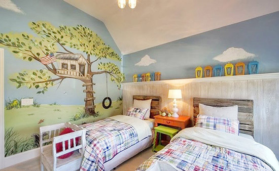 藍(lán)天白云綠樹(shù)的手繪墻兒童房,給孩子輕松自在的睡眠環(huán)境.美麗的卡通畫(huà)也會(huì)讓孩子更加喜歡自己的房間.
