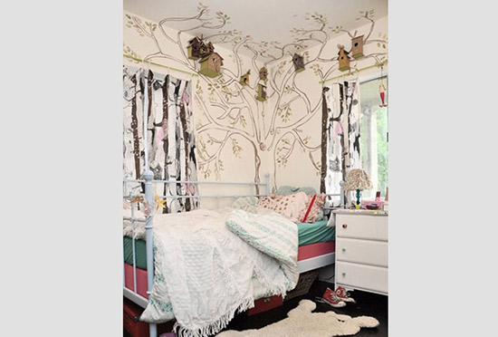 這棵小樹(shù)繪在墻角,茂密的枝干向四周延伸開(kāi),甚至到了天花板.設(shè)計(jì)師在枝干上點(diǎn)綴了幾只木匣子,讓樹(shù)一下子變得活靈活現(xiàn)起來(lái).