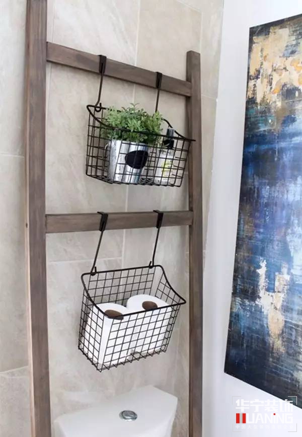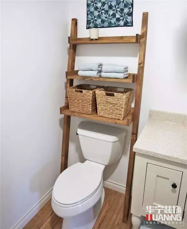 如果你覺得上面都比較麻煩,那么可以選擇擺一個小梯子在馬桶上方,靠墻安放,不會占用過多的空間,收納毛巾等很是方便。