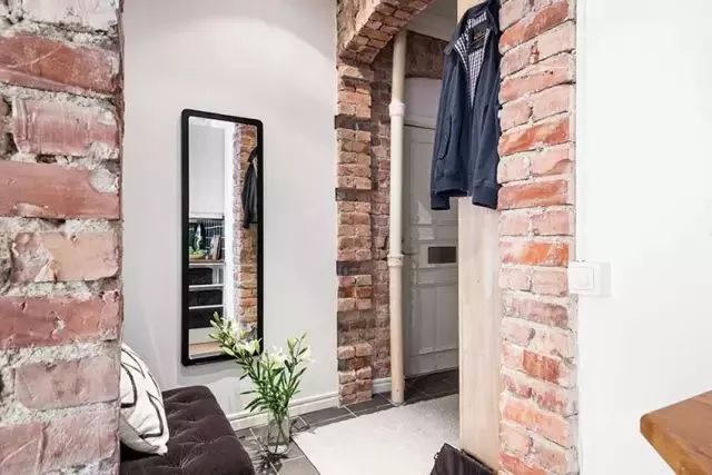 下圖案例是一個超小戶型,實(shí)用面積不超過30平米。但屋主設(shè)置了一個非常有格調(diào)的玄關(guān),用紅磚砌了墻面,非常有個性。還設(shè)置了坐椅和穿衣鏡,方便出門時整理儀態(tài)。