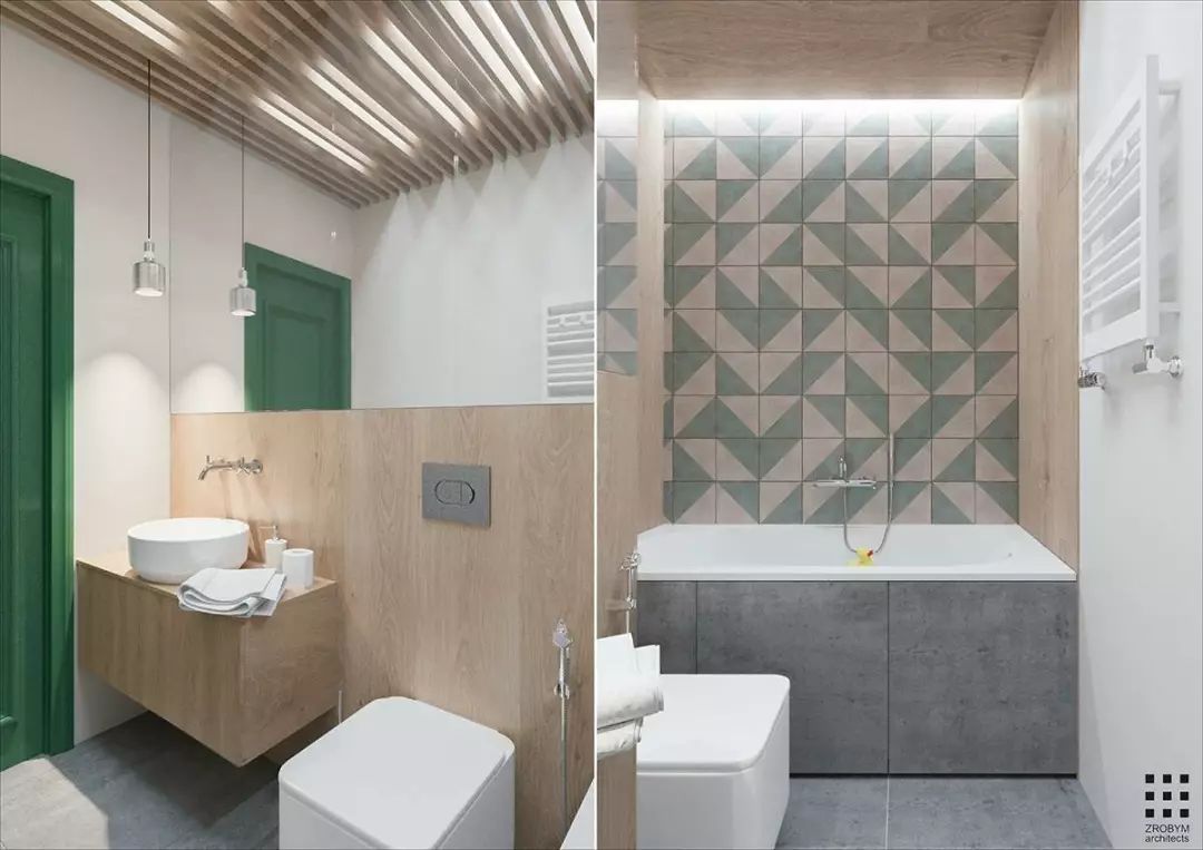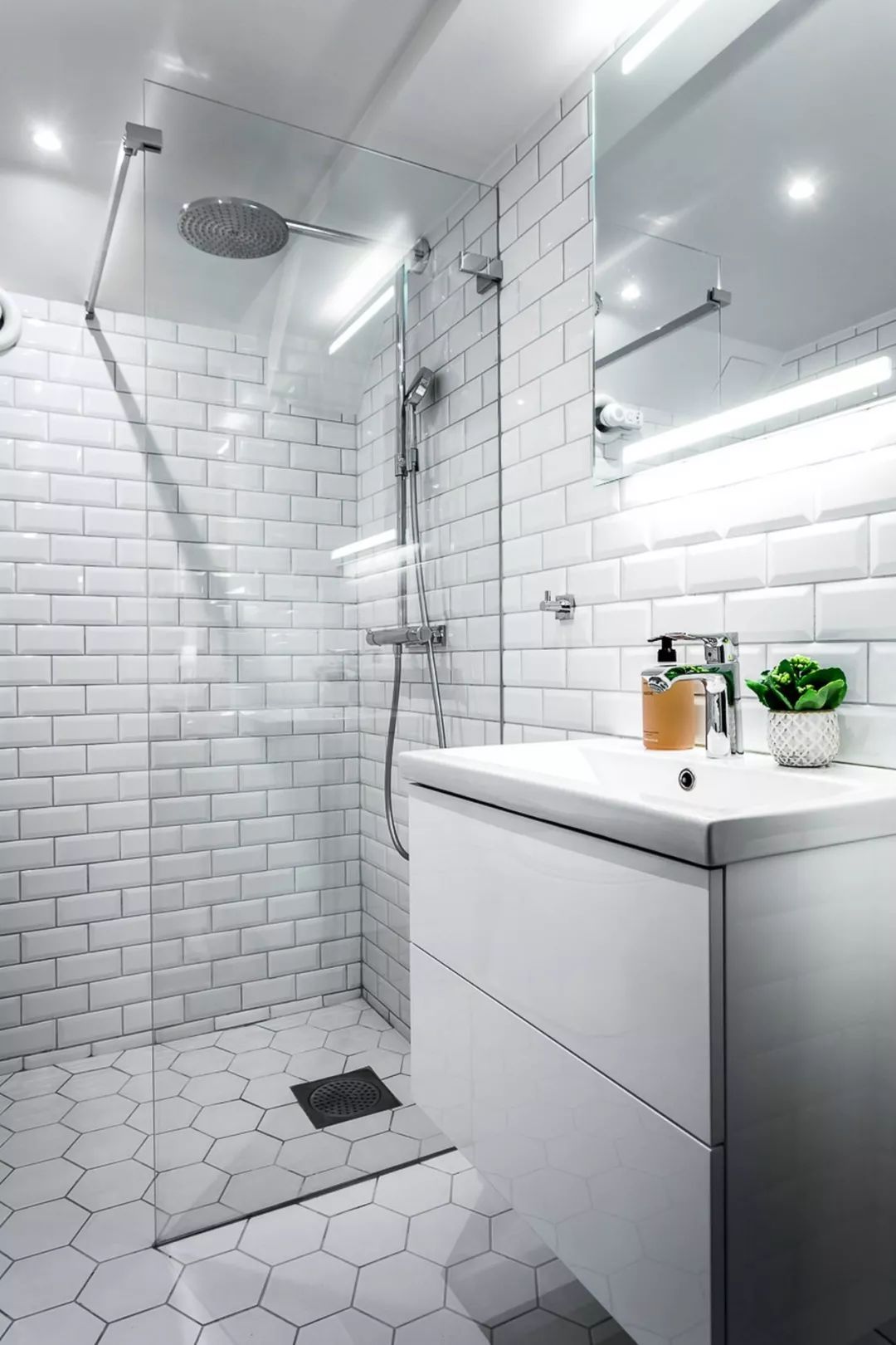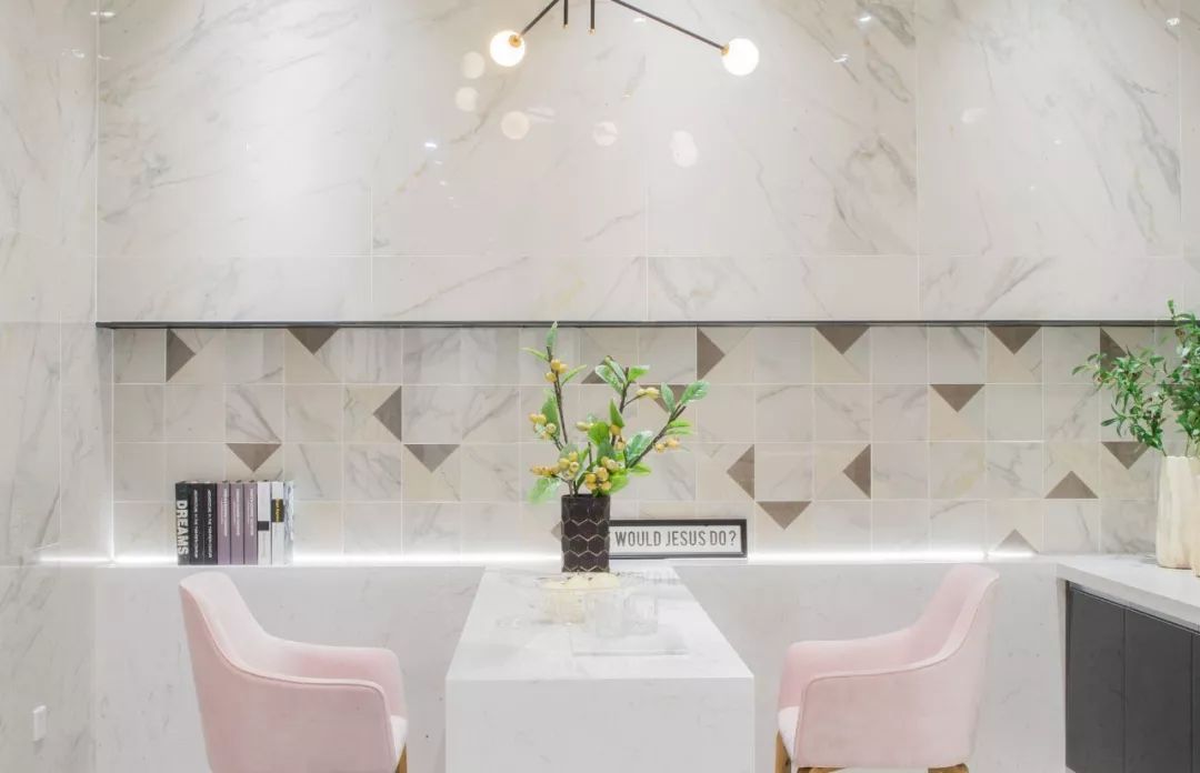 下圖案例墻面主色調(diào)是雪花雕像白,輔助以小花磚增色,相比于整片大面積使用一種瓷磚鋪貼的方法,這樣搭配讓空間更加生動。