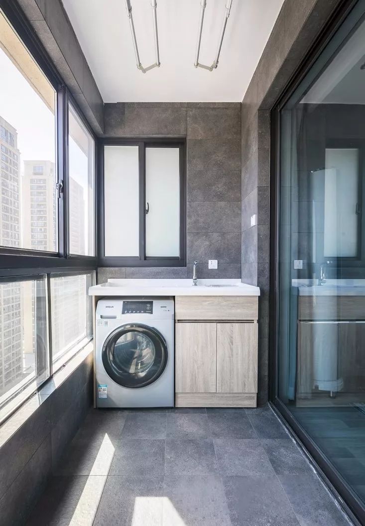 洗衣機放浴室怕受潮,放廚房又占地方,陽臺可以好好利用起來。通過定制置物架,把陽臺的部分空間做成洗衣房,洗衣、晾衣、燙衣,都可在陽臺上完成,實用性滿分。