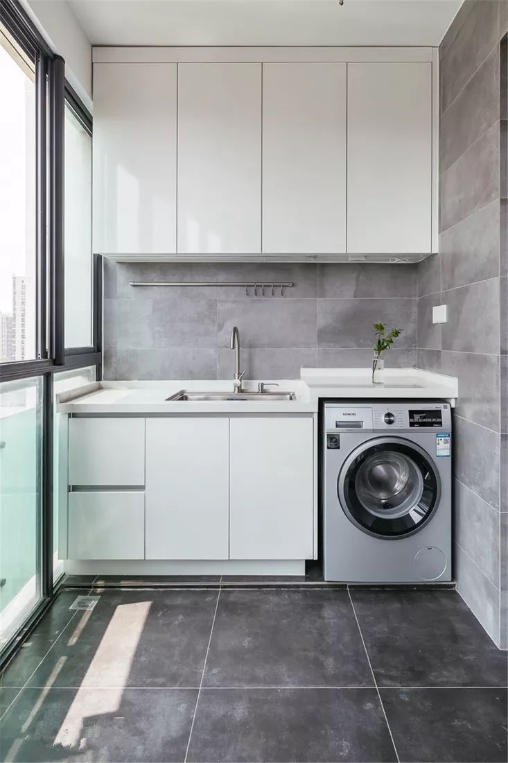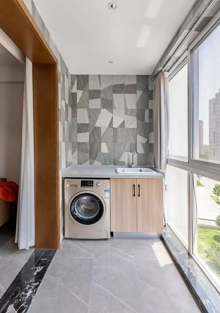 ▲ 在陽臺規(guī)劃出放洗衣機的空間,利用洗衣機上層空間放置各類清潔用品,安裝衣物晾曬架。