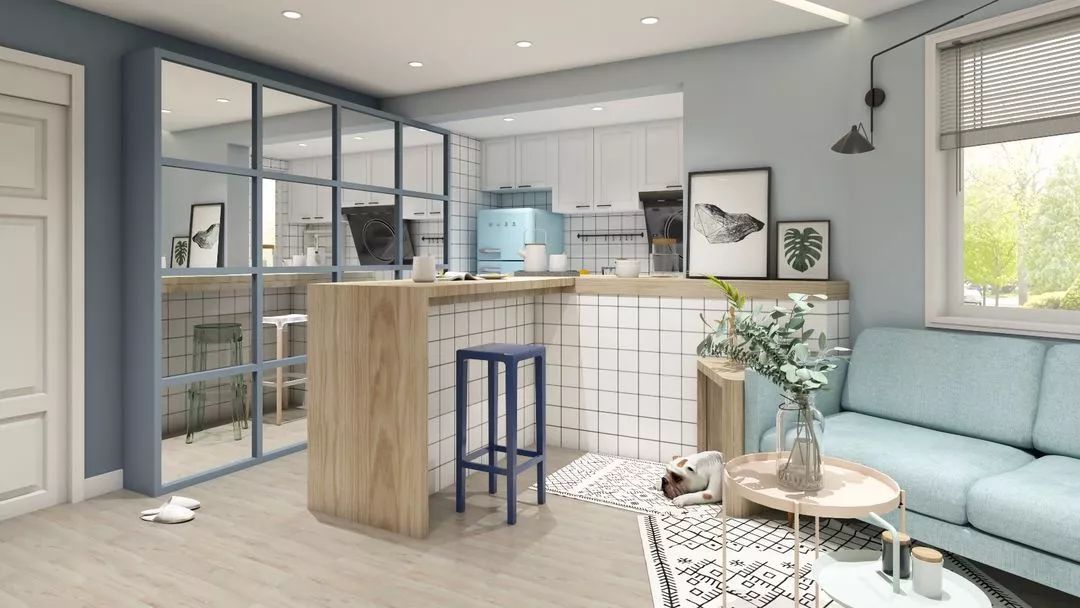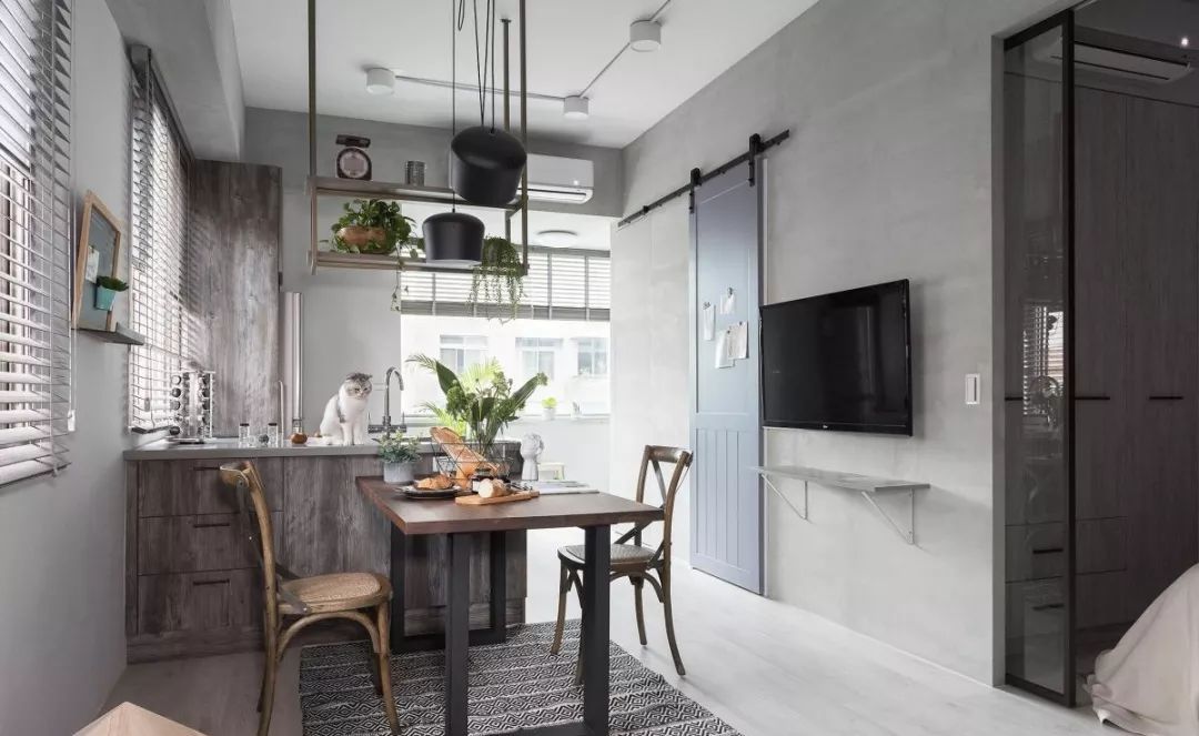 ▲小小的20平的單身公寓,餐廳可以設置成吧臺的形式,不僅可以充當餐桌、吧臺,還可以當做是餐廳和廚房的隔斷,這樣的一個轉角吧臺,節(jié)省了不少空間,而且讓整個的空間看上去也變大了不少。