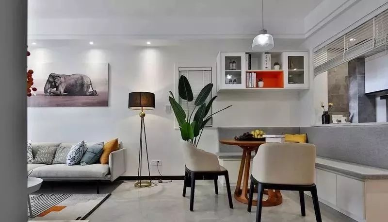 ▲客餐廳在同一個空間,餐廳是靠著角落設計,圓形的餐桌加上淺灰色的卡座設計,舒適且美觀。靠墻還裝了吊柜,增加了儲物空間,還不會占據(jù)空間。