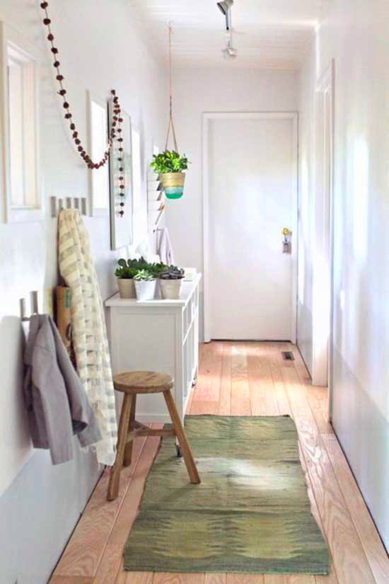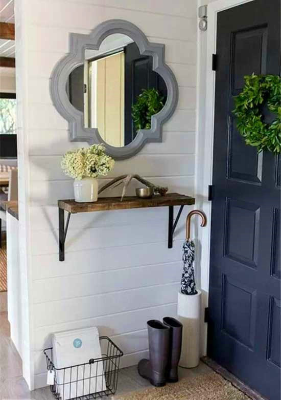 玄關(guān)的設計不一定要復雜才有美感,簡簡單單也可以別有一番風情。白墻上掛著灰框鏡子,一塊木頭擱板上面擺上花瓶用作裝飾,門上掛著綠葉圍成的花環(huán),有著一種清新自然之美。