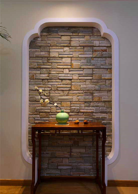 圓潤線條勾勒出假門邊框,文化石堆砌其中,一木桌、一花枝,簡單清雅的布景,充滿了典雅的中式韻味。