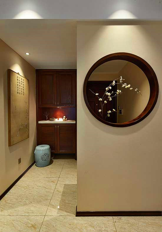 玄關(guān)處的隔墻上有一圓孔,借由室內(nèi)擺放的盆栽形成借景畫面,若隱若現(xiàn),意味深長。木制玄關(guān)柜配一只帶有古典雕花的圓凳,加上墻上的木板畫,顯出濃厚的中式禪韻。