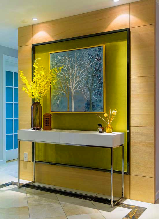 多層次構(gòu)成的玄關(guān)墻面,最外層是木板貼面,其次是草綠色背景,中央是一副樹木圖案的裝飾畫,搭配一款線條簡潔的玄關(guān)桌,時尚氣息濃厚而又不失清新感。