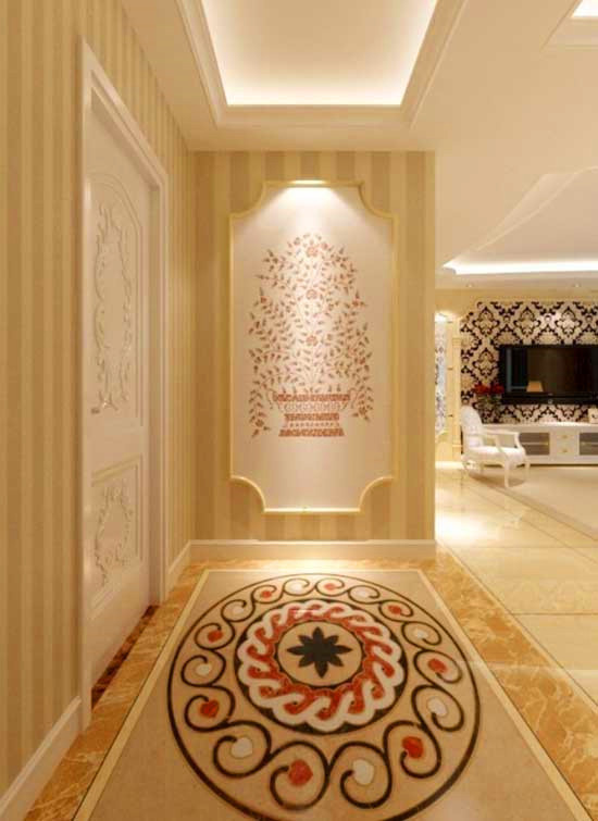 極具現(xiàn)代感的玄關(guān)設計,豎條紋壁紙拉伸了縱向視覺空間,墻上的古典壁畫搭配地面上的幾何紋地毯,呈現(xiàn)出極富藝術(shù)氣息的家居表情。