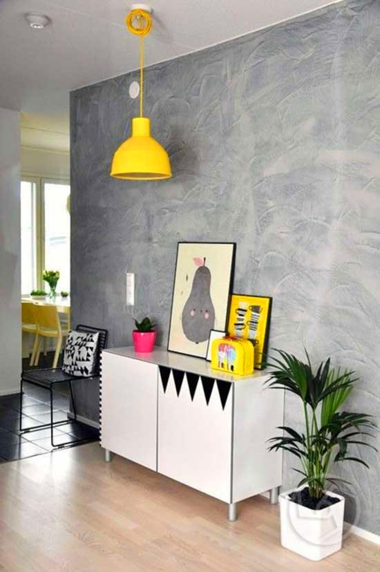 帶暗紋的灰色壁紙鋪滿玄關(guān)墻,白色簡約收納柜上帶有趣味圖案裝飾,亮黃色的吊燈、枚紅色的小花盆,讓中性色調(diào)的玄關(guān)瞬間有了色彩的活力。