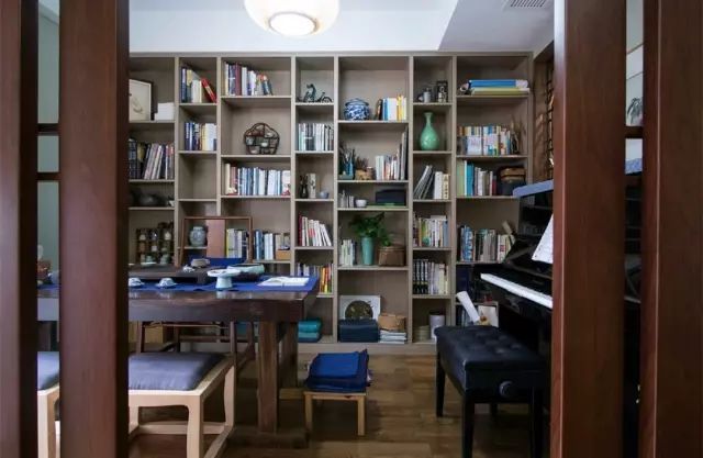 ▲大大的書架擺滿了藏書,還插入了一些禪意的中式花瓶作為擺飾,韻味很足。黑色的鋼琴為了孩子準備,桌上擺滿茶具,可以看出主人是愛茶藝的。