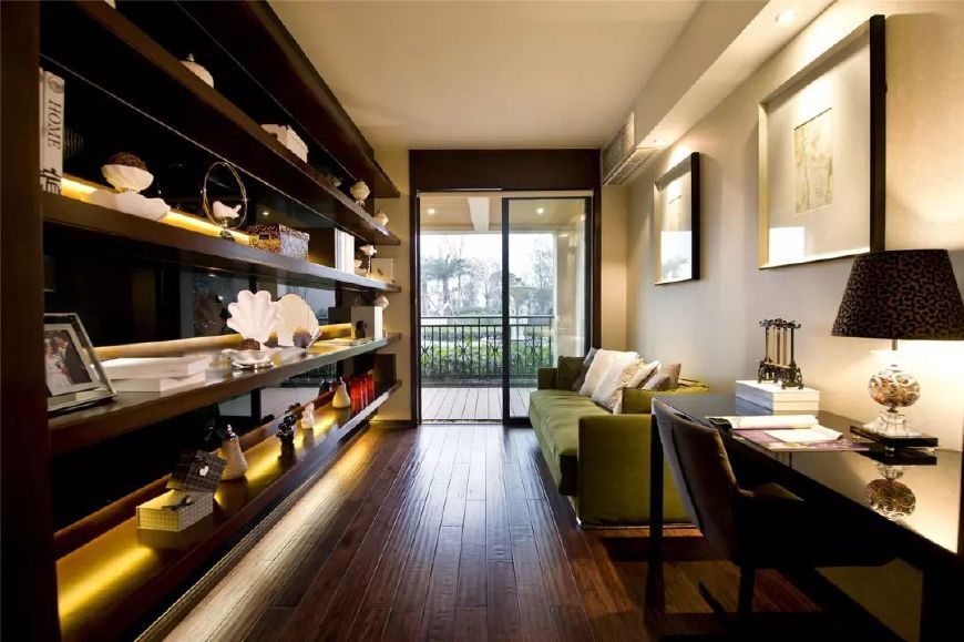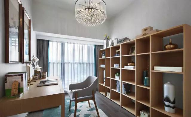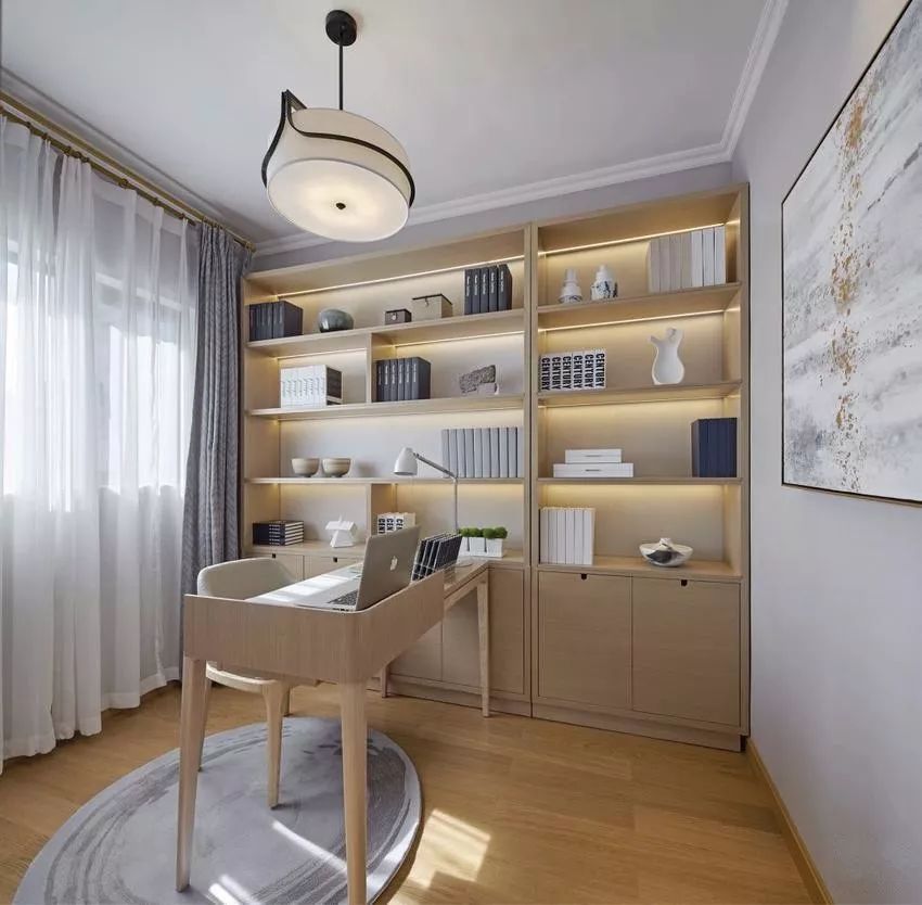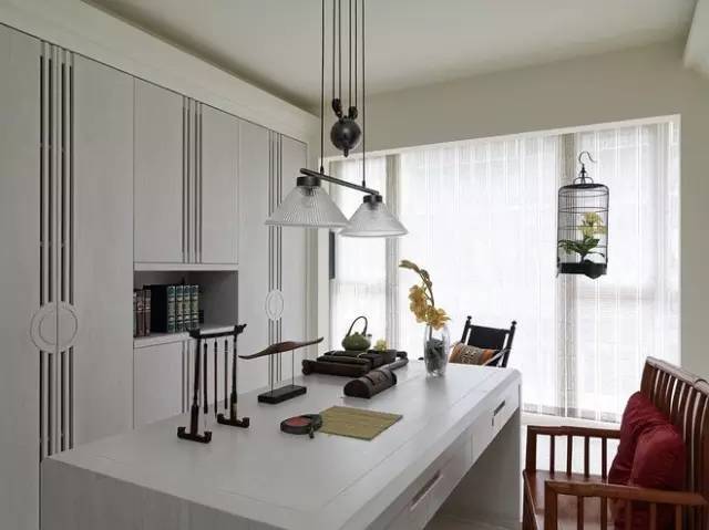 ▲設計合理劃分出書寫、電腦操作、藏書區(qū)域,保證了書房的功能性,同時在注意營造書香與藝術氛圍外,偌大的兩面窗和大主燈也保持了書房良好的通風與采光。