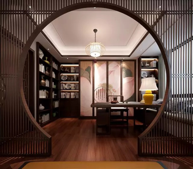 ▲開放式書房的設計,線條隔斷若隱若現(xiàn),營造一種朦朧美,柜子中間圓形的燈具裝飾,猶如一輪圓月,寓意團圓。