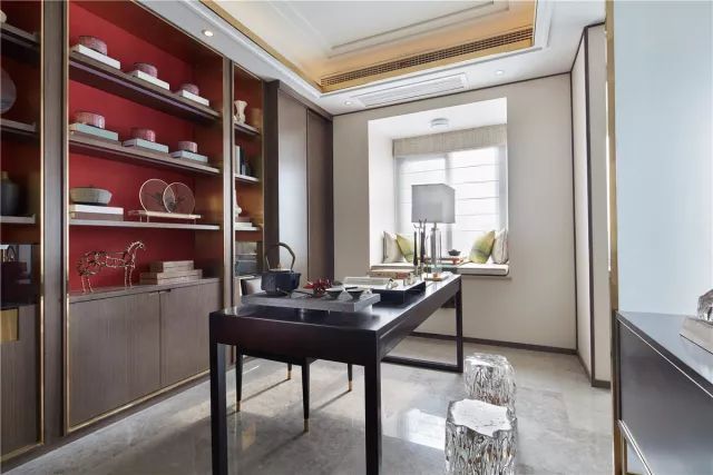 ▲書房配以現(xiàn)代中式風格的桌椅、書架,用以深木與代表中國的紅相結合,突顯了主人的涵養(yǎng)與學識。