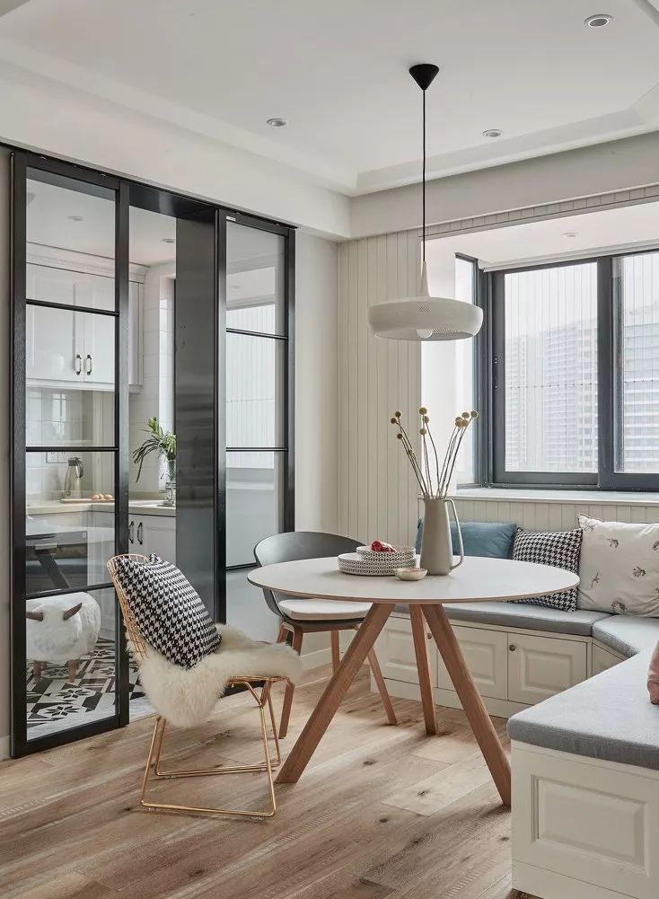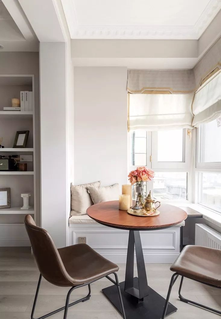 飄窗變身卡座,配合餐桌椅形成舒適的休閑區(qū)域,既美觀也可增加一定的餐廳收納。功能既完整,也不會影響動線的順暢。